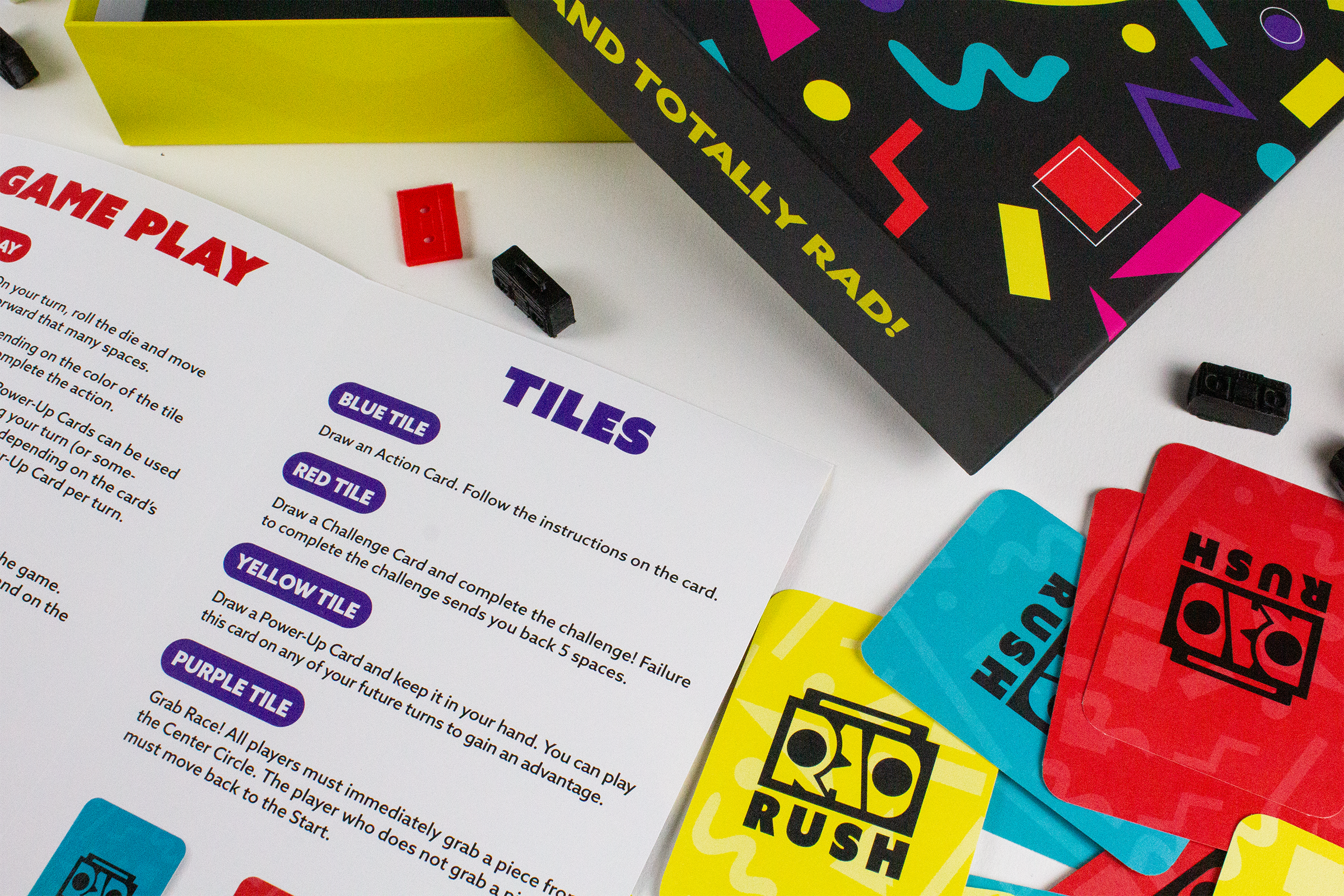 From a creative strategy standpoint, Rad Rush emphasizes a balance between strategy and spontaneity, aiming to engage players of all backgrounds. The game delivers a unique player experience through a blend of challenges and achievements, each designed to emulate the “rush” of the 80s’ high-energy culture. The deliverables for this project include a fully developed board game with a game board, three sets of cards, an instruction sheet and unique player pieces all packaged in an eye-catching box.
